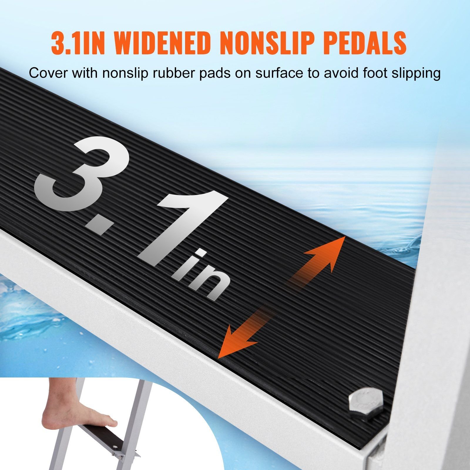 4.Ergonomic Design: 12 in step distance better fits body usage habits, which is more comfortable and labor-saving for you to enter the water and go ashore. The thickened round handrails bring you comfortable holding with hands.