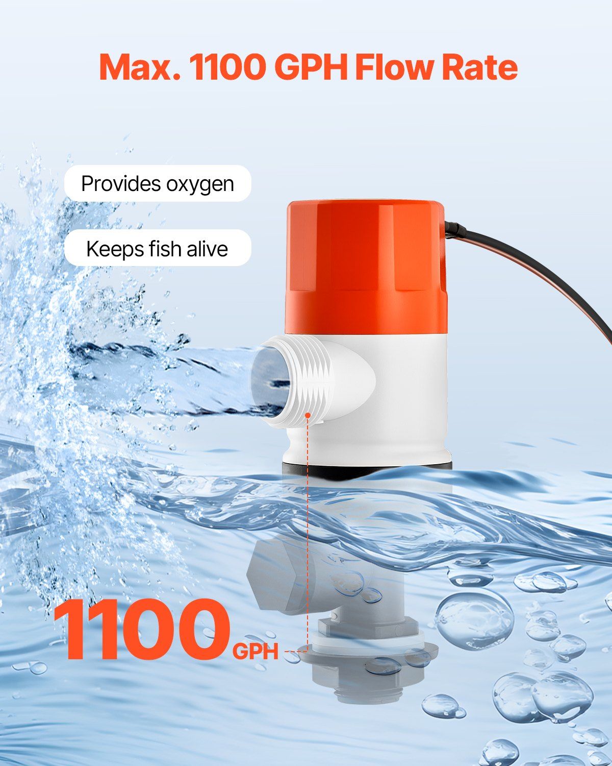Livewell Pump for Boat 12V 1100GPH Livewell Aerator Pump Straight 2 Inlets